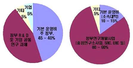 ´ëºÎºÐÀÇ ¿¹»êÀ» Á¤ºÎ¿¬±¸°³¹ß »ç¾÷À¸·ÎºÎÅÍ È®º¸Çϰí ÀÖ°í 10~15% °¡·®ÀÇ ±âº» ¿î¿µºñ¸¸ ´ëÇÐÀ¸·ÎºÎÅÍ Áö¿ø¹Þ´Â ¿ì¸® ´ëÇבּ¸¼ÒµéÀÌ Á¤ºÎ¿¬±¸°³¹ß°úÁ¦¸¦ ¼öÁÖÇÏÁö ¸øÇÏ¸é ¿¬±¸ Ȱµ¿ÀÌ ºÒ°¡ÇÑ »óȲ°ú´Â ´ëÁ¶ÀûÀÌ´Ù.
