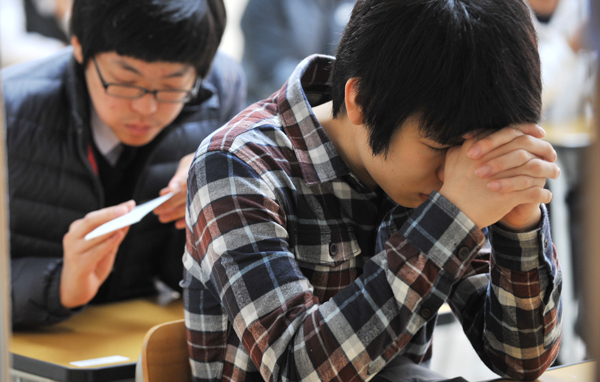 '°áÀüÀÇ ³¯'. ¿À´ÃÀ» À§ÇØ ÁغñÇØ ¿Â ½Ã°£, 2011Çг⵵ ´ëÇмöÇдɷ½ÃÇèÀÌ 18ÀÏ Àü±¹ 82°³ Áö±¸ ½ÃÇèÀå¿¡¼ ÀÏÁ¦È÷ Ä¡·¯Á³´Ù. ½ÃÇèÁö¸¦ ¹Þ¾Æ µç ¼öÇè»ý¿¡°Ôµµ, ¶È°°ÀÌ Àá ¸øÀÚ°í ¸¶À½ Á¹¿© µÞ¹Ù¶óÁö ÇØ ¿Â Çкθ𿡰Եµ °æÀǸ¦ Ç¥Çϸç ÁÁÀº °á°ú¸¦ ±â´ëÇØ º»´Ù. ¼¿ï °æº¹°í °í»çÀå¿¡¼ 1±³½Ã°¡ ½ÃÀ۵DZâ Àü ¸¶À½À» ¸ðÀ¸°í ÀÖ´Â ¼öÇè»ý.