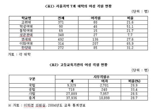 23ÀÏ °í·Á´ë ¿¬¼¼´ë µî ¼¿ïÁö¿ª 7°³ ´ëÇп¡ µû¸£¸é Á¤±ÔÁ÷ ÇàÁ¤Á÷¿ø(»ç¹«Á÷, ±â´ÉÁ÷) Áß ¿©¼ºÀÌ Â÷ÁöÇÏ´Â ºñÀ²Àº ¿©´ë¸¦ Á¦¿ÜÇßÀ» °æ¿ì, 22%¿¡ ºÒ°úÇß´Ù.(Ç¥1 Âü°í)