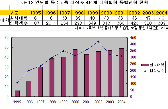 Àå¾ÖÀÎ ´ëÇÐÀÔÇРƯº°Á¦µµ¸¦ ÅëÇØ Áö³ÇرîÁö 4³âÁ¦ ´ëÇп¡ ÀÔÇÐÇÑ Àå¾ÖÇпì´Â ÃÑ 2õ9¹é11¸í. ÀÌ Á¦µµ¸¦ ½Ç½ÃÇÏ´Â ´ëÇеµ 1995³â 6°³ ´ëÇп¡¼ 2004³â 49°³ ´ëÇÐÀ¸·Î 8¹è°¡ Áõ°¡Çß°í ½ÃÇà Ã¹ÇØ 1¹é7¸íÀÇ Àå¾ÖÀÎ ´ëÇлýÀÌ Áö³ÇØ¿¡´Â 3¹é9¸íÀ¸·Î Áõ°¡ÇØ 3¹è°¡·® ´Ã¾î³µ´Ù.