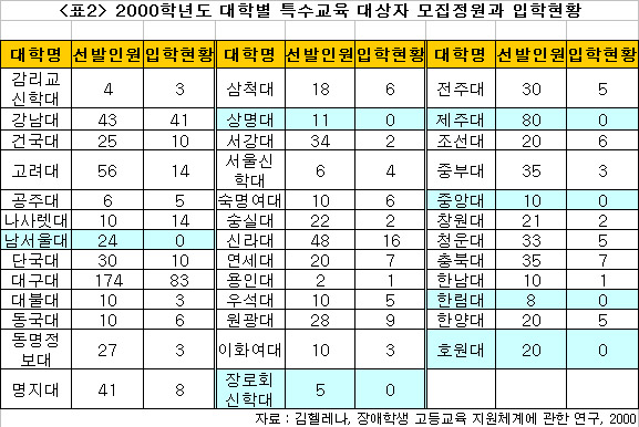 ÇÏÁö¸¸ ¸î¸î ´ëÇеéÀº ¸ðÁýÁ¤¿ø¸¸À» °í½ÃÇÑ Ã¤ ¾Æ¿¹ Ư¼ö±³À° ´ë»óÀÚ¸¦ ÇÑ ¸íµµ ¼±¹ßÇÏÁö ¾ÊÀº °ÍÀ¸·Î ³ªÅ¸³µ´Ù. Áö³ 2000Çг⵵ ´ëÇк° Ư¼ö±³À°´ë»óÀÚ ÀÔÇÐÇöȲÀ» º¸¸é ³²¼¿ï´ë, »ó¸í´ë, Àå·Îȸ½ÅÇдë, Á¦ÁÖ´ë, Áß¾Ó´ë, ÇѸ²´ë, È£¿ø´ë µî 7°³ ´ëÇÐÀº ¸ðÁýÀοø¸¸ ±ÔÁ¤ÇØ ³õÀº ä ÇлýÀ» ¼±¹ßÇÏÁö ¾Ê¾Ò´Ù.