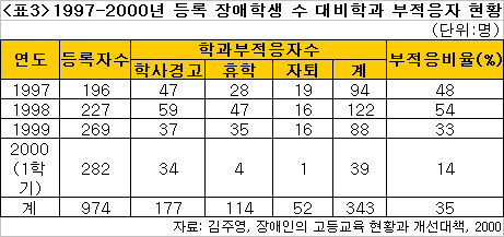 ƯÈ÷ Àå¾ÖÇлýÀÇ ´ëÇлýȰ ºÎÀûÀÀ ¹®Á¦´Â 1997³â 2000³â±îÁö 30°³ 4³âÁ¦ ´ëÇп¡ Ưº°ÀüÇü Á¦µµ·Î ÀÔÇÐÇÑ Çлý 9¹é74¸í Áß ÇÐ»ç°æ°íÀ², ÈÞÇаæÇèÀ², ÁßµµÆ÷±âÀ²ÀÌ °¢°¢ 18.2%(1¹é77¸í), 11.7%(1¹é14¸í), 5.3%(52¸í)À¸·Î ³ªÅ¸³ª ÃÑ 35%ÀÇ ÇлýµéÀÌ ºÎÀûÀÀÀ¸·Î ¾î·Á¿òÀ» °Þ´Â °ÍÀ¸·Î Áý°èµÆ´Ù.