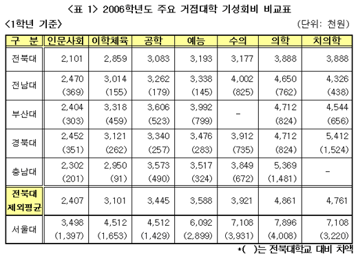 | ¡ã ÀüºÏ´ë¿Í Ÿ °ÅÁ¡ ±¹¸³´ë ±â¼ºÈ¸ºñ ºñ±³Ç¥. ¼öÇè·á¿Í ÀÔÇбÝÀº °ÅÀÇ µ¿ÀÏÇÑ ¼öÁØÀÌ´Ù. |