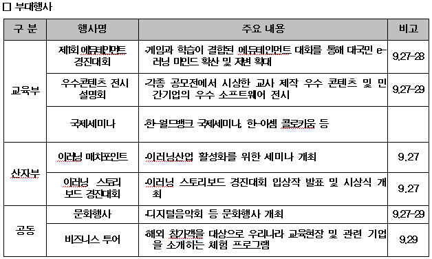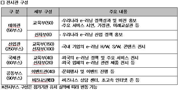 e-·¯´× Å׸¶°ü(56ºÎ½º) »ê¾÷°ü(250ºÎ½º) ±¹Á¦°ü(60ºÎ½º) µî 460°³ ºÎ½º¸¦ ¼³Ä¡Çϸç, ÃʵîÇлý ´ë»ó ¡®Á¦1ȸ ¿¡µàÅ×ÀÎÆ®¸ÕÆ® °æÁø´ëȸ¡¯µµ ÇÔ²² °³ÃÖÇÑ´Ù. e-·¯´× ¹ßÀü¹æÇâ¿¡ ´ëÇÑ ±¹Á¦¼¼¹Ì³ª µî °ü·Ã ±¹Á¦Çà»çµµ ¿¸°´Ù.