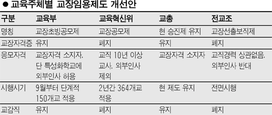 ±×·¯ÀÚ ±³¿øÆ¯À§ À§¿ø 23¸í Áß Çкθð À§¿ø µî 7¸íÀº ¡°±³À°ºÎ°¡ Çõ½ÅÀ§ ±³¿øÆ¯À§ ÀÇ»ç°áÁ¤°úÁ¤¿¡ ºÎ´çÇÏ°Ô °ü¿©Çß´Ù¡±¸ç Áö³ 12ÀÏ À§¿øÁ÷À» »çÅðÇß°í, Âü±³À°À» À§ÇÑ Àü±¹ Çкθðȸ¿Í Àü±³Á¶ µîÀº ¡®º¸Á÷Çü ±³Àå °ø¸ðÁ¦¡¯ ÇÕÀÇ¾È Àç³íÀǸ¦ Ã˱¸ÇؿԴÙ. ¹Ý¸é ±³À°ºÎ¿Í Çѱ¹±³ÃÑÀº º¸Á÷¿ë ±³Àå °ø¸ðÁ¦ Àç³íÀÇ ¹éÁöȸ¦ ÁÖÀåÇÏ´Â µî ±³À° °ü·Ã ÁÖüµéÀÌ ¼·Î ´Ù¸¥ ÁÖÀåÀ» Æì°í ÀÖ´Ù.(¾Æ·¡ Ç¥ Âü°í)