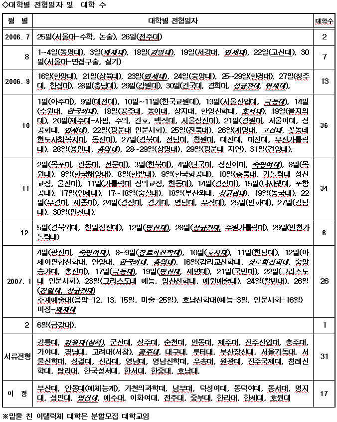 Àç¿Ü±¹¹Î°ú ¿Ü±¹ÀΠƯº°ÀüÇüÀº ´ëºÎºÐ ´ëÇÐÀÌ ¼ö½Ã2Çбâ Áß¿¡ ½Ç½ÃÇÏ¸ç ¼¿ï´ë, ÀüÁÖ´ë, ¹èÀç´ë, ¼°´ë, ¿¬¼¼´ë µî 9°³ ´ëÇÐÀº ¼ö½Ã1Çб⠱ⰣÀÎ 7~8¿ù¿¡ ¼±¹ßÇÑ´Ù. ¼÷¸í¿©´ë, ¼º±Õ°ü´ë, Çѱ¹¿Ü´ë µî 26°³ ´ëÇÐÀº Á¤½Ã¸ðÁý ±â°£ÀÎ 1¿ù¿¡ »Ì°í, ±Ý°´ë°¡ ³»³â 2¿ù 6ÀÏ °¡Àå ¸¶Áö¸·À¸·Î ½Ç½ÃÇÒ ¿¹Á¤ÀÌ´Ù.