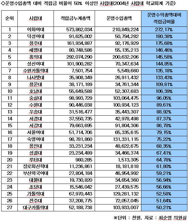 ÃÖ¼ø¿µ ÀÇ¿ø½Ç¿¡ µû¸£¸é 2004³â ÇöÀç Àüü »ç¸³(Àü¹®)´ëÀÇ Àû¸³±Ý ´©ÀûÃѾ×ÀÌ 5Á¶3õ1¹é53¾ï¿ø¿¡ À̸¥´Ù. ´ëÇÐ ÀçÁ¤¿î¿µ ±Ô¸ðÀÇ ±âÁØÀ» ¿î¿µ¼öÀÔÀ̶ó ÇßÀ» ¶§, 4³âÁ¦ ´ëÇÐ °¡¿îµ¥ 27°³ ´ëÇÐÀÌ ¿î¿µ¼öÀÔÃÑ¾× ´ëºñ Àû¸³±Ý´©°èÃѾ×ÀÌ 50%¸¦ ³Ñ¾ú´Ù. ÀÌÈ¿©´ë 272.2%, ´ö¼º¿©´ë 180.4% µî 1¹é%°¡ ³Ñ´Â ´ëÇеµ 10°³¿¡ ´ÞÇÑ´Ù.(¾Æ·¡ Ç¥ Âü°í)
