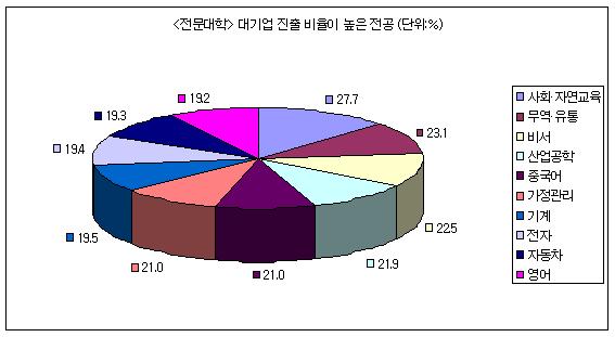 ´ë±â¾÷ ÁøÃâ ºñÀ²ÀÌ ³ôÀº »óÀ§ 10°³ Àü¹®´ëÇÐ Àü°øÀº »çȸ¤ýÀÚ¿¬±³À°(27.7%), ¹«¿ª À¯Åë(23.1%), ºñ¼(22.5%), »ê¾÷°øÇÐ(21.9%), Áß±¹¾î(21%), °¡Á¤°ü¸®(21%), ±â°è(19.5%), ÀüÀÚ(19.4%), ÀÚµ¿Â÷(19.3%), ¿µ¾î(19.2%) ¼øÀ¸·Î Áý°èµÆ´Ù.