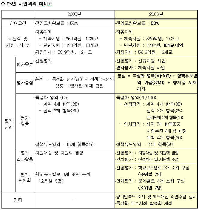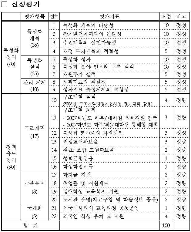 ½Å±Ô¼±Á¤ÀÇ °æ¿ì ¼º°ú°ü¸®¸¦ À§ÇØ ÀÚü Æò°¡ÁöÇ¥°¡ º°µµ Ç׸ñÀ¸·Î ºÐ¸®µÆ°í, ÇлýÁ¤¿ø¡¤±³¼ö ¼ö¡¤¿¬±¸ºñ µî ´ëÇÐÀÇ ÀÚ¿øÀÌ Æ¯¼ºÈ ºÐ¾ß·Î ÁýÁßµÈ Á¤µµ°¡ Æò°¡ÁöÇ¥·Î µé¾î°£ °ÍÀÌ °¡Àå Å©°Ô ´Þ¶óÁø Á¡ÀÌ´Ù. Ư¼ºÈ¿µ¿ª¿¡¼´Â ¡®°ü¸® üÁ¦¡¯ Ç׸ñÀÌ ½Å¼³(10Á¡)µÆ°í, Á¤Ã¥À¯µµ¿µ¿ªÀÇ ±¸Á¶°³Çõ Ç׸ñ¿¡¼´Â ¡®Æ¯¼ºÈ ºÐ¾ß·ÎÀÇ ÀÚ¿øÀçºÐ¡¯ ÁöÇ¥(¹èÁ¡ 3Á¡)°¡ »õ·Î µé¾î°¬´Ù. ÀÌ¿¡ µû¶ó Áö³Çغ¸´Ù ±¸Á¶°³ÇõÀ» Æ÷ÇÔÇÑ Á¤Ã¥À¯µµ¿µ¿ªÀÇ ¹èÁ¡ÀÌ 5Á¡ ÁØ(35¡æ30) ´ë½Å Ư¼ºÈ¿µ¿ªÀÇ ¹èÁ¡ÀÌ 5Á¡ ´Ã¾ú´Ù(65¡æ70).