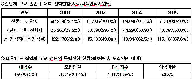 2005³â ½Ç¾÷°è °í±³ Á¹¾÷»ý 17¸¸2¹é59¸í °¡¿îµ¥ 67.6%ÀÎ 11¸¸5õ1¹é64¸íÀÌ ´ëÇп¡ ÁøÇÐÇßÀ¸¸ç ÀÌ °¡¿îµ¥ 62%´Â Àü¹®´ë, 38%´Â 4³âÁ¦ ´ëÇп¡ ÁøÇÐÇß´Ù. ½Ç¾÷°è °í±³ Ưº°ÀüÇüÀ¸·Î ÁøÇÐÇÑ ÇлýÀº 4³âÁ¦ ´ëÇÐ ÁøÇÐÀÚÀÇ 16%¶ó°í ±³À°ºÎ´Â ¹àÇû´Ù. Àü¹®´ë´Â ½Ç¾÷°è °í±³ Ưº°ÀüÇüÀ» ½Ç½ÃÇÏÁö ¾Ê°í ÀÖ´Ù.