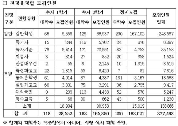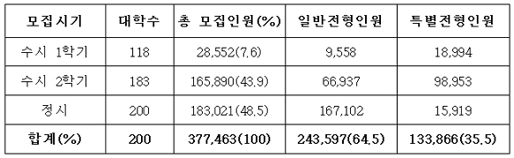 ´ëÇÐ µ¶ÀÚÀû ±âÁØ Æ¯º°ÀüÇü¿¡ Æ÷ÇԵƴø ¡®Æ¯¼ºÈ°í±³Æ¯º°ÀüÇü¡¯Àº Ư¼ºÈ°í°í(Ư¸ñ°í ¹× ½Ç¾÷°í µî) Á¹¾÷»ýÀÇ ´ëÇÐÁøÇРȰ¼ºÈ Â÷¿ø¿¡¼ º°µµ·Î ±¸ºÐÇØ 52°³ ´ëÇп¡¼ 7õ8¹é16¸íÀ» ¸ðÁýÇÑ´Ù.