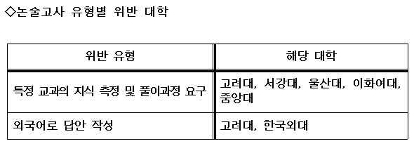 ±³À°ºÎ¿¡ µû¸£¸é °í·Á´ë¡¤¼°´ë¡¤¿ï»ê´ë¡¤ÀÌÈ¿©´ë¡¤Á߾Ӵ롤Çѱ¹¿Ü´ë µî 6°³ ´ëÇÐÀº ƯÁ¤±³°ú Áö½ÄÀ» ¹ÙÅÁÀ¸·Î Á¤´äÀ» ¿ä±¸ÇÏ´Â ¹®Á¦·Î ³í¼ú°í»ç ÃëÁö¸¦ À§¹èÇß´Ù. ÀÎÇϴ롤ÇѼº´ë¡¤ÇѾç´ë¡¤È«ÀÍ´ë µî 4°³ ´ëÇÐÀº ÀΡ¤Àû¼º °Ë»ç¿¡¼ º»·¡ ÃëÁö¿Í ´Þ¸® ÇÐ·Â°Ë»ç ¼º°ÝÀÌ °ÇÑ ¹®Á¦¸¦ ´Ù¼ö ÃâÁ¦ÇÑ °ÍÀ¸·Î È®ÀεƴÙ.