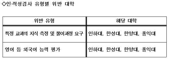 ÀÎÇϴ롤ÇѼº´ë¡¤ÇѾç´ë¡¤È«ÀÍ´ë´Â ƯÁ¤±³°úÀÇ Áö½ÄÀ» ÃøÁ¤Çϰųª Ç®À̰úÁ¤À» ¿ä±¸Çß°í, ÀÎÇϴ롤ÇѼº´ë¡¤ÇѾç´ë¡¤È«ÀÍ´ë´Â ¿µ¾î µî ¿Ü±¹¾î ´É·ÂÀ» Æò°¡ÇØ ÀΡ¤Àû¼º °Ë»çÀÇ ÃëÁö¸¦ ¹þ¾î³ °ÍÀ¸·Î ÆÇÁ¤¹Þ¾Ò´Ù.