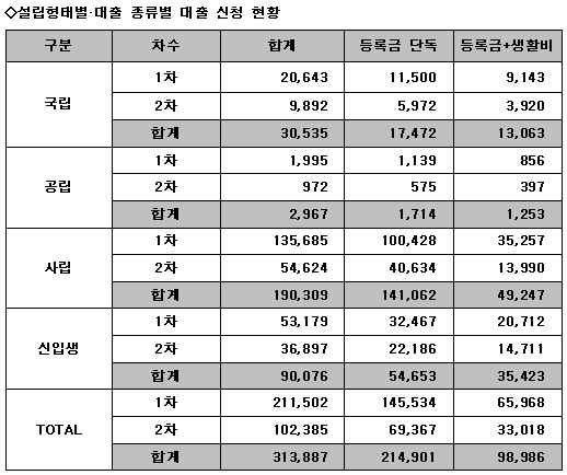 ¿Ã 1Çбâ ÇÐÀÚ±Ý ´ëÃâ ½ÅûÀÚ °¡¿îµ¥ µî·Ï±Ý¸¸ ½ÅûÇÑ ÇлýÀº 21¸¸4õ9¹é1¸íÀ̾úÀ¸¸ç, 9¸¸8õ9¹é86¸íÀº »ýȰºñ±îÁö ÇÔ²² ½ÅûÇÑ °ÍÀ¸·Î ³ªÅ¸³µ´Ù. 2005³â 2Çб⿡ ´ëÃâÀ» ¹ÞÀº Çлý °¡¿îµ¥ 9¸¸4õ1¹é30¸í(½ÅÀÔ»ý 2¹é79¸í Æ÷ÇÔ)Àº À̹ø Çб⿡µµ ´Ù½Ã ½ÅûÇÑ °ÍÀ¸·Î È®ÀεƴÙ.