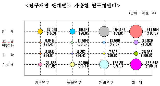 ´ëÇÐÀº ±âÃÊ¿¬±¸¿¡ µé¾î°£ 3Á¶7,068¾ï¿ø °¡¿îµ¥ 22.5%ÀÎ 8,338¾ïÀ», ÀÀ¿ë¿¬±¸¿¡ µé¾î°£ 5Á¶341¾ï¿ø °¡¿îµ¥ 16.4%ÀÎ 8,252¾ï¿øÀ» »ç¿ëÇß´Ù. ¹Ý¸é, °³¹ß¿¬±¸(15Á¶4,144¾ï¿ø) °¡¿îµ¥ Â÷ÁöÇÏ´Â ºñÁßÀº 4.8%(7,393¾ï¿ø)¿¡ ±×ÃÆ´Ù.