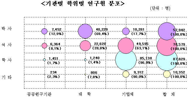 ±×·¯³ª ¹Ú»ç±Þ °í±Þ ¿¬±¸ ÀηÂÀº ´ëºÎºÐ ´ëÇп¡ Æ÷ÁøÇØ ÀÖ¾ú´Ù. ÃÑ ¿¬±¸¿ø 33¸¸5,428¸í °¡¿îµ¥ ´ëÇп¡ ¼Ò¼ÓµÈ ¿¬±¸¿øÀº 27.6%ÀÎ 6¸¸4,895¸íÀÎ ¹Ý¸é ¹Ú»ç±Þ ¿¬±¸¿ø Àüü 5¸¸7,942¸í °¡¿îµ¥ 69.4%ÀÎ 4¸¸229¸íÀÌ ´ëÇп¡¼ ÀÏÇØ, °í±Þ ÀηÂÀÇ ´ëÇÐ ÆíÁß Çö»óÀÌ µÎµå·¯Á³´Ù.