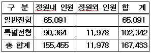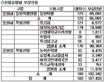 ÀÌ ¶§¹®¿¡ ÀϹÝÀüÇüº¸´Ù´Â Ưº°ÀüÇü ÀοøÀÌ ¸¹´Ù. ÀϹÝÀüÇüÀ¸·Î´Â 123°³ ´ëÇÐÀÌ 6¸¸5,091¸íÀ» ¼±¹ßÇÑ´Ù. ¹Ý¸é 180°³ ´ëÇÐÀÌ ¼ö½Ã2Çбâ Àüü ¸ðÁýÀοøÀÇ 61.1%¿¡ ÇØ´çÇÏ´Â 10¸¸2,342¸íÀ» Ưº°ÀüÇüÀ¸·Î »ÌÀ» °èȹÀÌ´Ù.