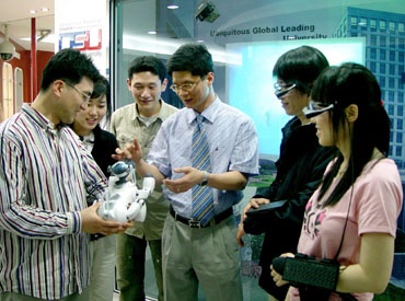 | ¡ã Áö³ 5¿ù 23ÀÏ ±¹³» ´ëÇÐ °¡¿îµ¥ óÀ½À¸·Î µ¿¼´ë¿¡ µé¾î¼± À¯ºñÄõÅͽºÃ¼Çè°ü ³» '¿þ¾î·¯ºíÄÄÇ»ÅÍ'Äڳʿ¡¼ ¾Ö¿Ï°ß ·Îº¿ ¾ÆÀ̺¸(AIBO)¸¦ ½Ã¿¬ÇØ º¸ÀÌ´Â ±³¼ö¿Í Çлýµé. |