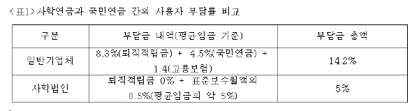 ÀÏ¹Ý ±â¾÷ü¿¡ ºñÇØ »çÇйýÀÎÀÇ ºÎ´ã±ÝÀÌ ÅξøÀÌ ³·´Ù´Â °Íµµ Á÷¿øµéÀÌ ³»¼¼¿ì´Â ÇÑ ÀÌÀ¯´Ù. ÀϹݱâ¾÷ü´Â ÅðÁ÷Àû¸³±Ý°ú ±¹¹Î¿¬±Ý, °í¿ëº¸Çè, »êÀ纸ÇèÀ» ÇÕÇØ Æò±ÕÀÓ±ÝÀÇ ÃÑ 14% ÀÌ»óÀ» ºÎ´ãÇϰí ÀÖ´Â ¹Ý¸é »çÇйýÀÎÀº Ç¥Áغ¸¼ö¿ù¾×ÀÇ 8.5%¸¸ ºÎ´ãÇϰí ÀÖ´Ù´Â °Í.