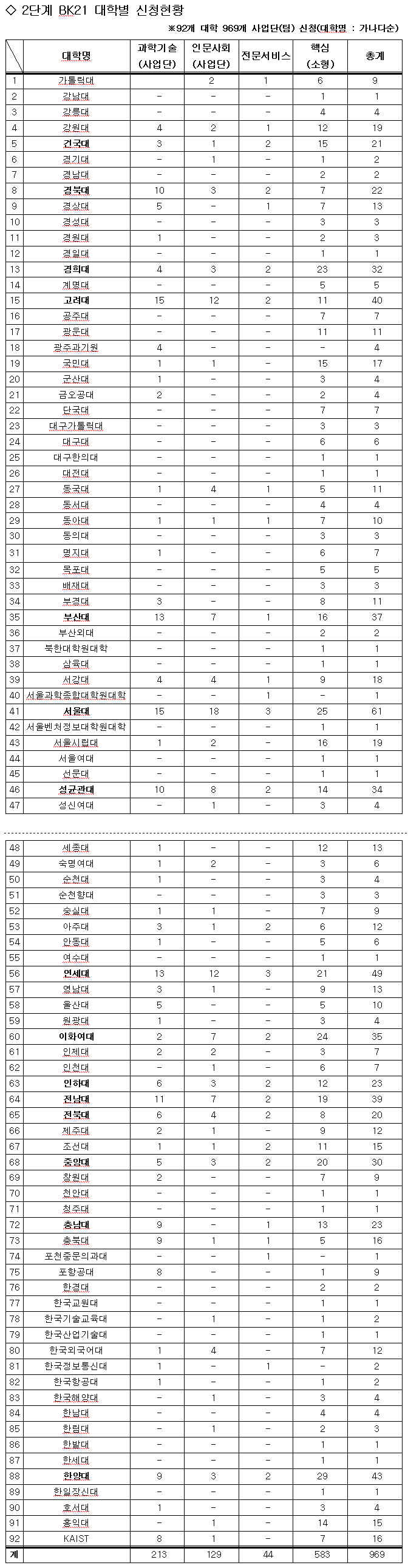 ¼¿ïÁö¿ª ÁÖ¿ä´ëÇÐ °¡¿îµ¥´Â ¿¬¼¼´ë°¡ 49°³(´ëÇü 28, ¼ÒÇü 21), ÇѾç´ë 43°³(14, ¼ÒÇü 29), °í·Á´ë 40°³(´ëÇü 29, ¼ÒÇü 11), ÀÌÈ¿©´ë 35°³(´ëÇü 11, ¼ÒÇü 24), ¼º±Õ°ü´ë 34°³(´ëÇü 20, ¼ÒÇü 14), °æÈñ´ë 32°³(´ëÇü 9, ¼ÒÇü 23) »ç¾÷´Ü(ÆÀ)ÀÌ ½ÅûÇß´Ù.