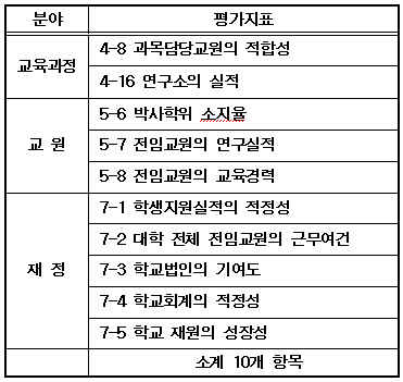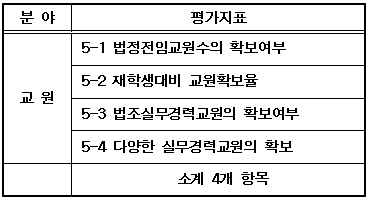 ½ÇÀûÀ¸·Î Æò°¡ÇÏ´Â Ç׸ñÀº 10°³ Ç׸ñ¿¡ ºÒ°úÇÏ´Ù. ±³À°°úÁ¤ Áß¿¡¼µµ °ú¸ñ´ã´ç±³¿øÀÇ ÀûÇÕ¼ºÀ̳ª ¿¬±¸¼Ò ½ÇÀû, ±³¿ø °ü·Ã ºÐ¾ßÀÇ ÀüÀÓ±³¿ø ¹Ú»çÇÐÀ§ ¼ÒÁöÀ²¡¤¿¬±¸½ÇÀû¡¤±³À°°æ·Â µîÀÌ ¿©±â¿¡ ÇØ´çµÈ´Ù.