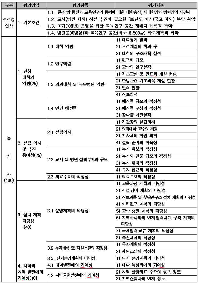 º»½É»ç´Â 100Á¡ ¸¸Á¡À¸·Î, ½Åû´ëÇÐÀÇ ¿ª·®(25Á¡) ¼³¸³ÀÇÁö ¹× ÃßÁø ¿ëÀ̼º(25Á¡) ¼³Ä¡°èȹÀÇ Å¸´ç¼º(40Á¡) ´ëÇаú Áö¿ª ¹ßÀü¿¡ÀÇ ±â¿©(10Á¡)·Î ³ª´² Æò°¡ÇÑ´Ù.