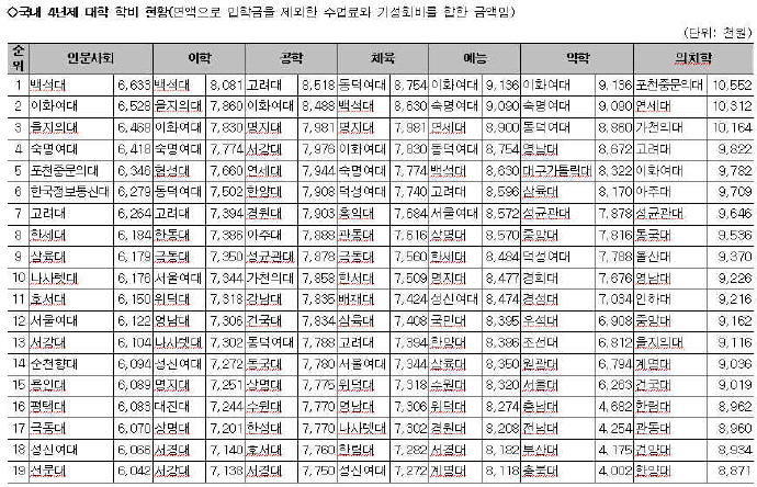 ¿Ã µé¾î µî·Ï±Ý Àλó ÆÄµ¿À» °Þ¾ú´ø ÀÌÈ¿©´ëµµ Çкñ°¡ ºñ½Ñ ´ëÇÐÀ¸·Î ³ªÅ¸³µ´Ù. ¿¹´É°ú ¾àÇа迿¡¼´Â 913¸¸6,000¿øÀ¸·Î Çкñ°¡ °¡Àå ºñ½Ñ ´ëÇÐÀ¸·Î Á¶»çµÆ´Ù. Àι®»çȸ°è¿ 2À§(652¸¸8,000¿ø) ÀÌÇÐ°è¿ 3À§(783¸¸¿ø) üÀ°°è¿ 4À§(783¸¸¿ø), ÀÇ¡¤Ä¡ÀÇÇÐ °è¿ 5À§(978¸¸2,000¿ø) µî ´Ù¸¥ °è¿¿¡¼µµ »óÀ§ 5À§±Ç ¾È¿¡ °ñ°í·ç µé¾ú´Ù.
