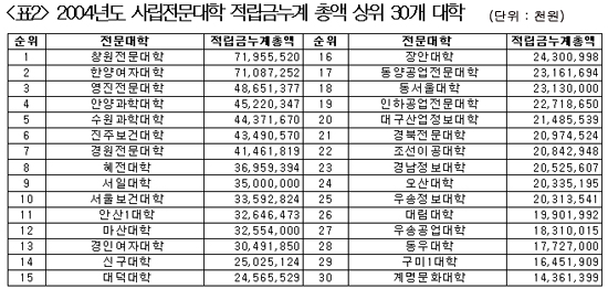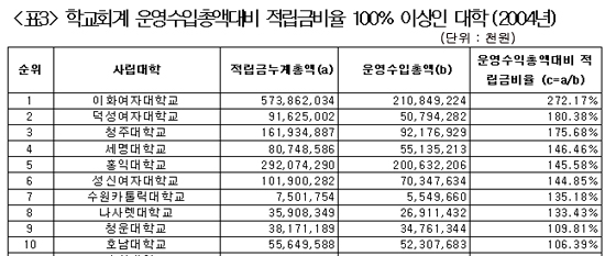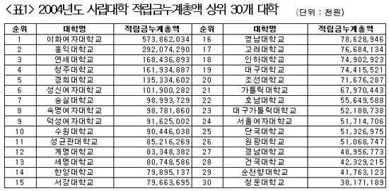 ±¹È¸ ±³À°À§ ÃÖ¼ø¿µ ÀÇ¿ø(¹ÎÁֳ뵿´ç)ÀÌ 15ÀÏ ¹ßÇ¥ÇÑ ¡®»ç¸³´ë Àû¸³±Ý ÇöȲ ºÐ¼® °á°ú¡¯¿¡ µû¸£¸é 2004³â ÇöÀç Àü±¹ ´ëÇÐ(4³âÁ¦ 1¹é56°³±³, Àü¹®´ëÇÐ 1¹é43°³±³)¿¡¼ °¡Àå ¸¹Àº Àû¸³±ÝÀ» ¸ð¾ÆµÐ °÷Àº 5õ7¹é38¾ï¿øÀ» Àû¸³ÇÑ ÀÌÈ¿©´ë¿´´Ù. <Ç¥1 Âü°í>
