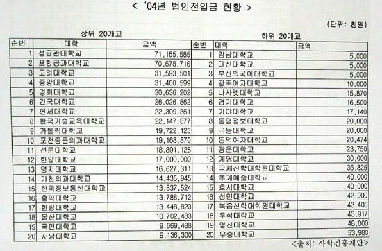 ÇÑÆí 2003³â ´ëºñ 2004³â ¹ýÀÎÀüÀÔ±ÝÀÌ °¡Àå Å©°Ô Áõ°¡ÇÑ ´ëÇÐÀº °í·Á´ë·Î, ÀÌ ´ëÇÐÀº 2003³â ¹ýÀÎÀüÀÔ±ÝÀÌ 58¾ï¿øÀ̾úÀ¸³ª Áö³ÇØ¿¡´Â 3¹é15¾ï¿øÀ¸·Î 2¹é57¾ï¿øÀ» ´õ Áö¿ø¹ÞÀº °ÍÀ¸·Î ³ªÅ¸³µ´Ù.