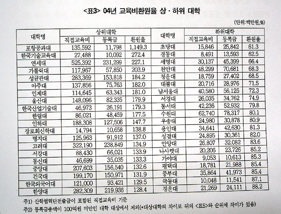 Á¶»ç ´ë»ó 1¹é51°³±³ Áß 2004³â ÇöÀç ±³À°ºñȯ¿øÀ² 100%¿¡ ¸ø¹ÌÄ¡´Â ´ëÇÐÀº 54°³±³·Î ÀüüÀÇ 35.8%. »ó´ëÀûÀ¸·Î ±³À°ºñȯ¿øÀ²ÀÌ ³ôÀº ´ëÇÐÀÇ ºñÀ²ÀÌ ´ÃÁö ¾ÊÀº °Íµµ ¹®Á¦·Î ÁöÀûµÆ´Ù. ±³À°ºñȯ¿øÀ² 150%¸¦ ³Ñ´Â ´ëÇÐÀÇ ºñÀ²Àº Áö³ 2000³â 15.4%¿´À¸³ª 5³âÀÌ Áö³ 2004³â¿¡µµ 15.2%·Î Çö»óÀ¯Áö¿¡ ±×ÃÆ´Ù.