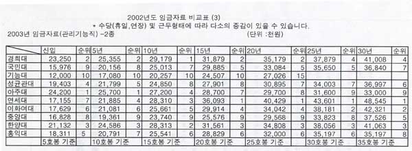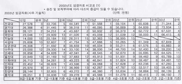 °æÈñ´ë ³ëÁ¶°¡ 14°³ »ç¸³ ´ëÇаú ±â´É´ëÀÇ ¿ÃÇØ ÀÓ±ÝÇöȲÀ» ºÐ¼®ÇÑ °á°ú, »ç¹«±â¼úÁ÷ ½ÅÀÔ¿¬ºÀ(8±Þ 3È£ºÀ ±âÁØ)ÀÇ °æ¿ì ÇѾç´ë´Â 2õ8¹é14¸¸4õ¿øÀ» ¹ÞÁö¸¸ ±â´É´ë ±³Á÷¿ø ¿¬ºÀÀº 1õ4¹é¸¸¿ø¿¡ ºÒ°úÇØ, µÎ¹è°¡ ³Ñ´Â ÀӱݰÝÂ÷¸¦ º¸¿´´Ù. ¶Ç »ç¹«±â¼úÁ÷ÀÇ °æ¿ì »óÀ§ 5°³±³ ÀÓ±ÝÆò±ÕÀº 2õ7¹é48¸¸2õ4¹é¿øÀ̾úÁö¸¸, ±â¼ú±â´ÉÁ÷ »óÀ§5°³±³ Æò±ÕÀº 2õ2¹é11¸¸8õ¿øÀ¸·Î ¹«·Á 5¹é30¿©¸¸¿øÀÇ Â÷À̰¡ ³µ´Ù. <Ç¥> ÂüÁ¶