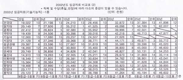 ´ëÇа£ ±â¼ú±â´ÉÁ÷ ½ÅÀÔ ¿¬ºÀ(9µî±Þ 3È£ºÀ ±âÁØ)À» »ìÆìº¸¸é 2õ3¹é17¸¸7õ¿øÀ» ±â·ÏÇÑ ÇѾç´ë°¡ »ç¹«±â¼úÁ÷¿¡ À̾î Á¦ÀÏ ¸¹Àº ¿¬ºÀÀ» ¹Þ´Â °ÍÀ¸·Î ³ªÅ¸³µ°í, È«ÀÍ´ë°¡ 2õ3¹é12¸¸3õ¿øÀ¸·Î ±× µÚ¸¦ À̾ú´Ù. °æÈñ´ë(2õ2¹é41¸¸2õ¿ø), ¼°´ë(2õ1¹é12¸¸9õ¿ø) ¿¬¼¼´ë(2õ74¸¸9õ¿ø)µµ Ÿ ´ëÇк¸´Ù »ó´ëÀûÀ¸·Î ¸¹Àº ¿¬ºÀÀ» ¹Þ´Â °ÍÀ¸·Î Á¶»çµÆ´Ù. ±â´É´ë´Â 1õ2¹é¸¸¿øÀ» ¹Þ´Â °ÍÀ¸·Î ³ªÅ¸³ª ÃÖÇÏÀ§¸¦ ±â·ÏÇß´Ù.