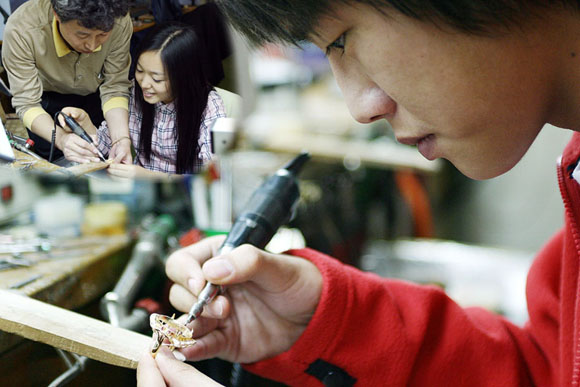 | ¡ã ±Í±Ý¼Ó »ê¾÷ÀÇ ¹ßÀü°ú ÇÔ²² °ü·ÃÇаúÀÇ Àα⵵ Ä¡¼Ú°í ÀÖ´Ù. »çÁøÀº ±Í±Ý¼ÓµðÀÚÀÎ ¼¼°ø ½Ç½ÀÁßÀÎ µ¿½Å´ë Çлýµé(»çÁøÁ¦°ø=µ¿½Å´ë) |