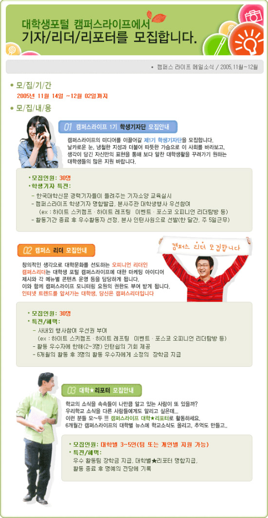 ¸ðÁýºÐ¾ß´Â »çȸ Àü¹Ý¿¡ °ÉÄ£ À̽´¸¦ ´ëÇлýÀÇ ½Ã¼±À¸·Î ºÐ¼®ÇÒ Çлý±âÀÚ, Ä·ÆÛ½º¶óÀÌÇÁ À¥¼ºñ½º Àü¹Ý¿¡ ´ëÇÑ ¸¶ÄÉÆÃÀ» ÇÔ²²ÇÒ Ä·ÆÛ½º¸®´õ, ¼Ò¼Ó ´ëÇÐÀÇ ¼Ò½Ä°ú Áö¿ª»çȸ À̽´¸¦ Àü´ÞÇÒ ´ëÇи®Æ÷ÅÍ µî 3°³ ºÎ¹®.