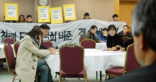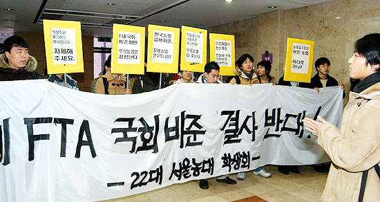 ÀÌ¿¡ ¸Â¼ ¼¿ï´ë ³ó°ú´ë ¼Ò¼Ó Çлý 20¿©¸íÀº À̳¯ ±³¼öµéÀÇ FTA ºñÁØ¾È Ã˱¸¿¡ ´ëÇØ °ÇÏ°Ô ¹Ý¹ßÇÏ¸é¼ Àå³»¿Ü¿¡¼ ¡°Çѱ¹ ³ó¾÷ ¾ø¾îÁö¸é Ä¥·¹³ó¾÷ ¿¬±¸ÇϽóª¿ä?¡±¸¦ ¿ÜÄ¡¸ç ½ÃÀ§¸¦ ¹ú¿´´Ù.