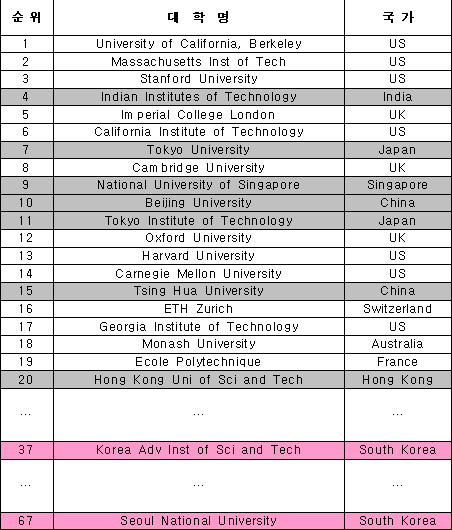 ÀÌ ºÐ¾ß ¼¼°è ÃÖ°í ´ëÇÐÀ¸·Î´Â ¹Ì±¹ÀÇ UC¹öŬ¸®°¡ ¼±Á¤µÆÀ¸¸ç MIT(2À§)¿Í ½ºÅÄÆÛµå ´ëÇÐ(3À§)°¡ µÚ¸¦ À̾ú´Ù. ¾Æ½Ã¾ÆÁö¿ª¿¡¼´Â ÀϺ»ÀÇ µµÄì´ëÇÐÀÌ °úÇÐºÐ¾ß ¼¼°è7À§¿¡ ÀÌ¾î °øÇÐ ¹× ITºÐ¾ß¿¡¼µµ ¼¼°è7À§¸¦ Â÷ÁöÇÏ´Â Äè°Å¸¦ ÀÌ·ðÀ¸¸ç, Àεµ°ø´ë(4À§), ½Ì°¡Æ÷¸£ ±¹¸³´ë(9À§), ºÏ°æ´ë(10À§) µîµµ »óÀ§±Ç¿¡ ±â·ÏµÆ´Ù.