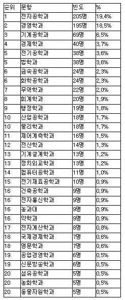 »ó°æ°è¿ÀÌ 28.8%(311¸í)·Î ±× ´ÙÀ½À¸·Î ¸¹¾ÒÀ¸¸ç »çȸ°úÇÐ°è¿ 6.4%(69¸í), ¹ýÇÐ°è¿ 3.5%(38¸í)ÀÇ ¼øÀ̾ú´Ù.