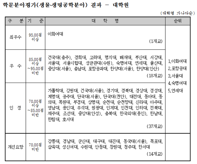 <Ç¥>Çй®ºÐ¾ßº° ´ëÇÐÆò°¡°á°ú(»ý¹°/»ý¸í°øÇÐ)