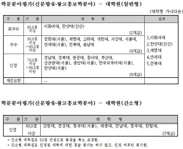 <Ç¥>Çккоߺ° ´ëÇÐÆò°¡°á°ú(½Å¹®¹æ¼Û/±¤°íÈ«º¸)