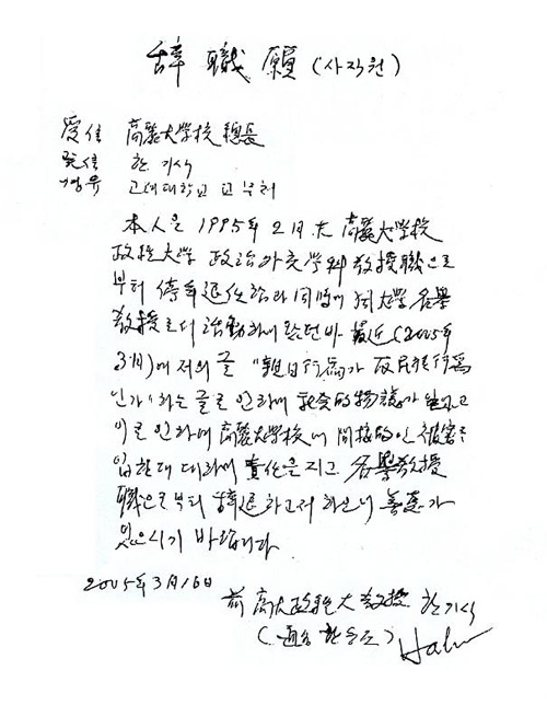 ÇÑ ¸í¿¹±³¼ö´Â »çÁ÷¼¿¡¼ "ÃÖ±Ù(2005³â 3¿ù) ÀúÀÇ ±Û 'Ä£ÀÏÇàÀ§°¡ ¹Ý¹ÎÁ·ÇàÀ§Àΰ¡'¶ó´Â ±Û·Î ÀÎÇÏ¿© »çȸÀû ¹°Àǰ¡ ÀϾú°í ÀÌ·Î ÀÎÇÏ¿© °í·Á´ë¿¡ °£Á¢ÀûÀÎ ÇÇÇØ¸¦ ÀÔÈùµ¥ ´ëÇÏ¿© Ã¥ÀÓÀ» Áö°í ¸í¿¹±³¼öÁ÷À¸·ÎºÎÅÍ »çÀÓÇϰíÀÚ ÇÑ´Ù"°í ¹àÇû´Ù.