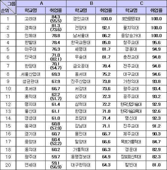 <Ç¥1>4³âÁ¦ ´ëÇÐ Ãë¾÷·ü(3°³ ±×·ìº°)