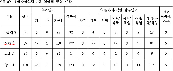 ´ëÇмöÇдɷ½ÃÇ輺ÀûÀÇ ¼ö¸® ¹× ޱ¸¿µ¿ª ¹Ý¿µÀº ´ëºÎºÐ ¼ö¸® °¡¡¤³ª¿Í »çȸ¡¤°úÇС¤Á÷¾÷ ޱ¸¿µ¿ªÀ» ¸ðµÎ ¼±Åð¡´É Çϸç, ¼ö´ÉÀÇ ¡®Ç¥ÁØÁ¡¼ö¡¯¸¦ Ȱ¿ëÇÏ´Â ´ëÇÐÀÌ 1¹é4°³±³, ¡®¹éºÐÀ§¡¯¸¦ Ȱ¿ëÇÏ´Â ´ëÇÐÀÌ 90°³±³, È¥ÇÕȰ¿ë ´ëÇÐÀÌ 5°³±³ µîÀÌ´Ù.