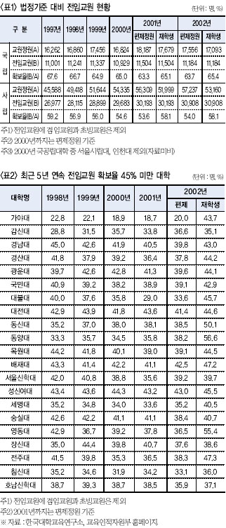 Áö³ 98³âºÎÅÍ 2002³â±îÁö ÃÖ±Ù 5³â°£ ¹ýÁ¤±âÁØ ´ëºñ ±³¿ø È®º¸ ÇöȲÀ» ºÐ¼®ÇÑ °á°ú, ±¹¸³´ëÇÐÀº 65%³»¿Ü¸¦ ±â·ÏÇϰí ÀÖÀ¸³ª, »ç¸³´ëÇÐÀº Çѹøµµ 60%¸¦ ³ÑÁö ¸øÇÑ °ÍÀ¸·Î ³ªÅ¸³µ´Ù. ´õ¿íÀÌ ±³À°ÀÎÀûÀÚ¿øºÎ(ÀÌÇÏ ¡®±³À°ºÎ¡¯)°¡ 2001³âºÎÅÍ Çлý ¼ö°¡ Àû¾îÁ³´Ù¸ç, ±³¿ø È®º¸ ±âÁØÀ» ÆíÁ¦Á¤¿ø ±âÁØ¿¡¼ ÀçÇлý ±âÁØÀ¸·Î º¯°æÇØ ÁÖ¾úÀ½¿¡µµ ±¹¡¤»ç¸³´ëÇÐ ¸ðµÎ ÃÖ±Ù 5³â°£ ½ÇÁúÀûÀÎ º¯È°¡ °ÅÀÇ ¾ø´Â °ÍÀ¸·Î ³ªÅ¸³µ´Ù.
