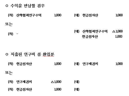 A. ¿¬±¸ºñ ÀÌ¿ù±ÝÀ» Áö¿ø±â°ü¿¡ ¹Ý³³ÇÒ °æ¿ì ´ç ȸ°è¿¬µµÀÇ Áö¿ø±ÝÀ» ´ç ȸ°è¿¬µµ¿¡ ¹Ý³³ÇÒ °æ¿ì¿Í Â÷³âµµ¿¡ ¹Ý³³ÇÒ °æ¿ì°¡ ÀÖ½À´Ï´Ù. µÎ °¡Áö °æ¿ì¿¡ µû¶ó ȸ°è󸮰¡ ´Þ¶óÁú ¼ö ÀÖ½À´Ï´Ù. ´çÇØ³âµµ ¼öÀÔÀ» ´çÇØ³âµµ¿¡ ¹Ý³³ÇÒ °æ¿ì º» °èÁ¤(»êÇÐÇù·Â¿¬±¸¼öÀÍ)À» °¨¼ÒÇÏ´Â ºÐ°³¸¦, ´çÇØ¿¬µµ ¼öÀÔÀ» Â÷±â³âµµ¿¡ ¹Ý³³ÇÒ °æ¿ì Àü±â¿À·ù¼öÁ¤¼Õ½Ç·Î ó¸®ÇÏ´Â °ÍÀÌ ÀûÀýÇÒ °ÍÀ¸·Î »ç·áµË´Ï´Ù.