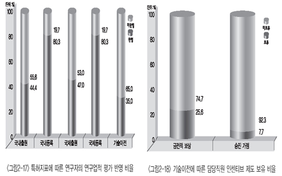 Çѱ¹ÇмúÁøÈïÀç´ÜÀÌ ÃÖ±Ù ¹ß°£ÇÑ ´ëÇлêÇÐÇù·Â¹é¼ 2006³âÆÇ¿¡ µû¸£¸é 117°³ ´ëÇÐ Áß Æ¯ÇãÁöÇ¥¸¦ ¿¬±¸ÀÚÀÇ ¾÷ÀûÆò°¡¿¡ ½ÇÁúÀûÀ¸·Î ¹Ý¿µÇÏ´Â °æ¿ì´Â ±â¼úÀÌÀüÀÌ 35.0%(41°³±³), ±¹³»Ãâ¿øÀÌ 44.4%(52°³±³), ±¹Á¦Ãâ¿øÀÌ 47.0%(55°³±³)·Î ä Àý¹Ýµµ ¾ÈµÇ´Â °ÍÀ¸·Î ³ªÅ¸³µ´Ù. ±¹³»¤ý±¹Á¦ µî·ÏÀÌ °¢°¢ 80.3%(94°³±³)·Î ±×³ª¸¶ ¾÷ÀûÆò°¡·Î °£ÁֵǴ ºñÀ²ÀÌ ³ô¾Ò´Ù.