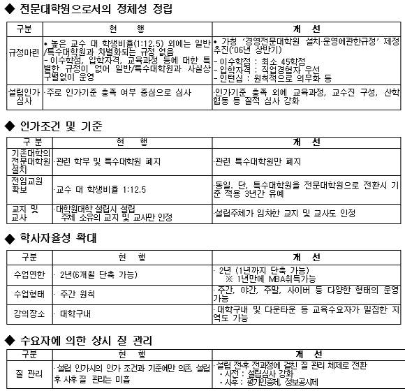 ¿ì¼± ±³À°ºÎ´Â ±âÁ¸ ´ëÇÐÀÌ °æ¿µÀü¹®´ëÇпøÀ» ¼³Ä¡ÇÒ ¶§ °ü·Ã ÇкΠ¹× Ư¼ö´ëÇпøÀ» ÆóÁöÇϵµ·Ï ÇÑ Á¶°ÇÀ» ¿ÏÈÇØ °ü·Ã Çкθ¦ ÆóÁöÇÏÁö ¾Ê¾Æµµ °æ¿µÀü¹®´ëÇпø ¼³Ä¡°¡ °¡´ÉÇϵµ·Ï ÇßÀ¸¸ç, Ư¼ö´ëÇпøÀ» Àü¹®´ëÇпøÀ¸·Î ÀüȯÇÒ °æ¿ì¿¡´Â ÀüÀÓ±³¿ø ´ë Çлý ºñÀ²(1 ´ë 12.5) Àû¿ëÀ» 3³â°£ À¯¿¹ÇØ ÁÖ±â·Î Çß´Ù.