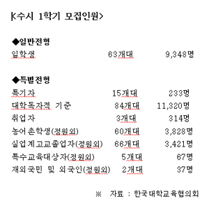 ¡ßÀÔ½Ã¿ä° ²Ä²ÄÈ÷ ºÁ¾ß= Çѱ¹´ëÇб³À°ÇùÀÇȸ(ȸÀå ±Ç¿µ°Ç ¾Èµ¿´ë ÃÑÀå)°¡ 27ÀÏ ¹ßÇ¥ÇÑ Àü±¹ 116°³ ´ëÇÐÀÇ ¼ö½Ã 1Çб⠽ÅÀÔ»ý ¸ðÁý¿ä°¿¡ µû¸£¸é, ÀϹÝÇлý ÀüÇüÀ¸·Î 63°³ ´ëÇÐÀÌ 9õ348¸íÀ», Ưº°ÀüÇüÀ¸·Î 106°³ ´ëÇÐÀÌ 1¸¸9õ220¸íÀ» °¢°¢ »Ì´Â´Ù. ÀÌ´Â Áö³Çغ¸´Ù 981¸íÀÌ Áõ°¡ÇÑ °ÍÀ¸·Î, ½ÅÀÔ»ý ¸ðÁýÀÌ ¾î·Á¿î ´ëÇеéÀÌ ¸ðÁý±âȸ¸¦ È®´ëÇϱâ À§ÇØ ¼±¹ßÀοøÀ» È®´ëÇ߱⠶§¹®À¸·Î ÆÇ´ÜµÈ´Ù.