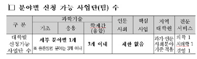 ¡ß½Åû °¡´É »ç¾÷´Ü(ÆÀ)= ±âÃÊ¡¤ÀÀ¿ë µî °úÇбâ¼ú ¹× ÀǷᡤ°æ¿µ µî °í±ÞÀü¹®¼ºñ½º ºÐ¾ß´Â ºÐ¾ßº° 1°³ »ç¾÷´ÜÀ¸·Î ½ÅûÀÌ Á¦ÇѵȴÙ. ´Ü, ÀÀ¿ë»ý¸í°ú ÇÐÁ¦°£(À¶ÇÕ) ºÐ¾ß´Â 3°³ À̳»·Î ½ÅûÀÌ °¡´ÉÇϸç, Àι®»çȸ ºÐ¾ß¿Í Çٽɻç¾÷Àº Á¦ÇÑÀÌ ¾ø´Ù.