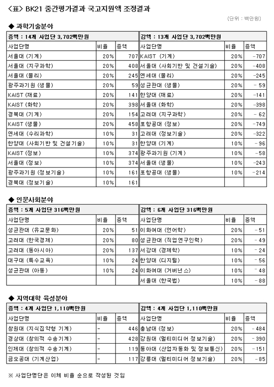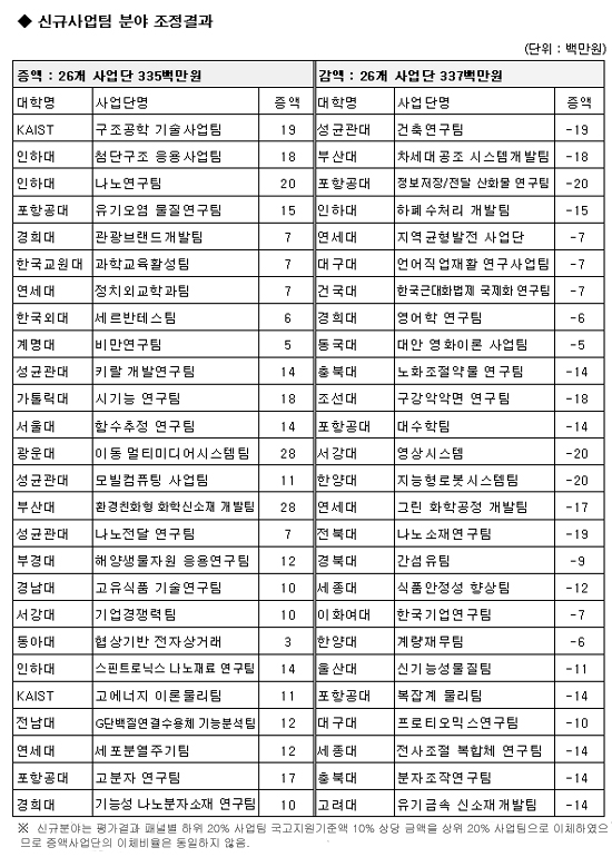 °¢ ºÐ¾ßº°·Î »è°¨µÈ »ç¾÷ºñ´Â °°Àº ºÐ¾ß¿¡¼ ¿ì¼öÇÑ ¼º°ú¸¦ ³½ »ç¾÷´Ü¿¡ Áõ¾×µÇ´Âµ¥, ¡â°úÇбâ¼úºÐ¾ß¿¡¼´Â ¼¿ï´ë ±â°èºÐ¾ß µî 14°³ »ç¾÷´Ü¿¡ ÃÑ 37¾ï7¹é¸¸¿ø ¡âÀι®»çȸºÐ¾ß´Â ¼º±Õ°ü´ë µ¿¾Æ½Ã¾Æ±³À°¿¬±¸´Ü µî 5°³ »ç¾÷´Ü¿¡ ÃÑ 3¾ï1õ8¹é¸¸¿ø ¡âÁö¿ª´ëÇÐ À°¼ººÐ¾ß´Â â¿ø´ë Áö½ÄÁý¾àÇü±â°è µî 4°³ »ç¾÷´ÜÀÌ ÃÑ 11¾ï1õ1¹é¸¸¿øÀ» Áõ¾×¹Þ°Ô µÆ´Ù. <Ç¥ Âü°í>