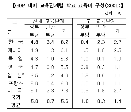 2001³â ±âÁØ Á¤ºÎ¿Í Çкθ𰡠´ëÇб³À°¿¡ ÅõÀÚÇÏ´Â ±³À°ºñ´Â GDPÀÇ 2.7%·Î ÀÌ °¡¿îµ¥ ¹Î°£ºÎ´ã·üÀÌ 2.3%·Î Àüü °íµî±³À°ºñÀÇ 85.2%¸¦ Â÷ÁöÇÑ ¹Ý¸é, Á¤ºÎºÎ´ãÀº 14.81%(GDPÀÇ 0.4%)¿¡ ºÒ°úÇß´Ù.